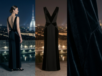200.000,00 €Il prezzo originale era: 200.000,00 €.120.000,00 €Il prezzo attuale è: 120.000,00 €.Occasione: fashion week / red carpet sperimentale € 200.000 abito da sera haute couture realizzato con strati di organza nera e tulle color carne, scolpito in una silhouette architettonica con pieghe verticali nette e zone di trasparenza controllate.