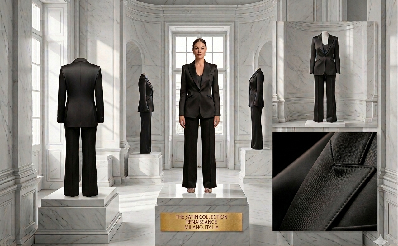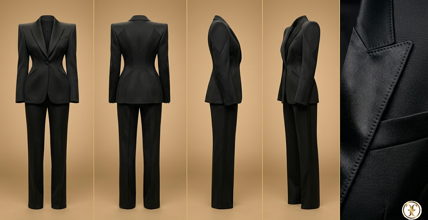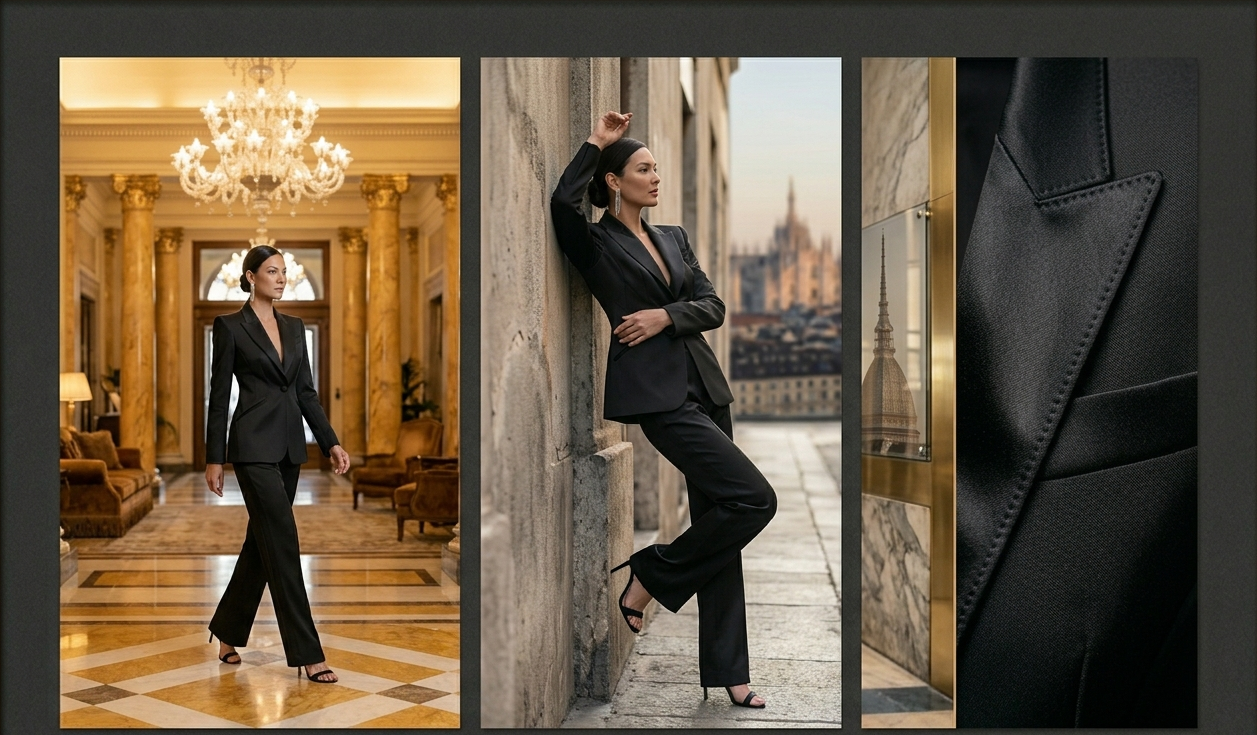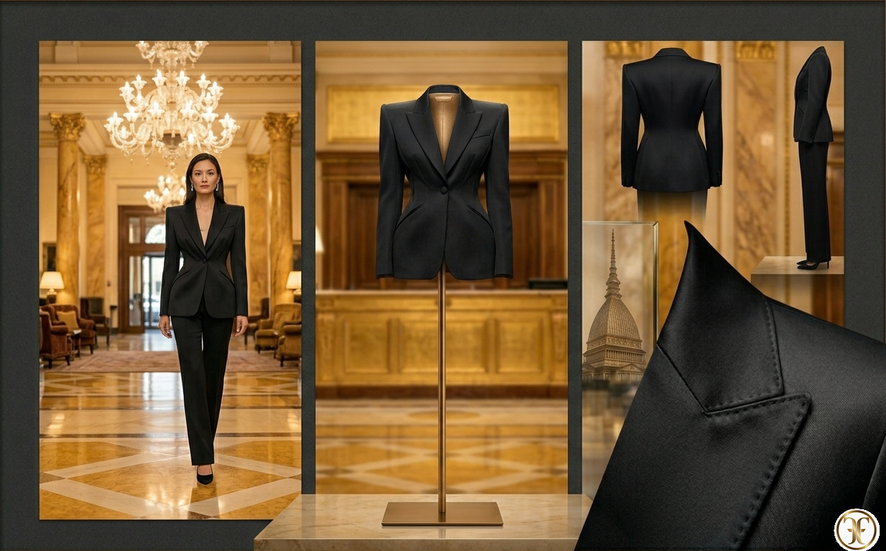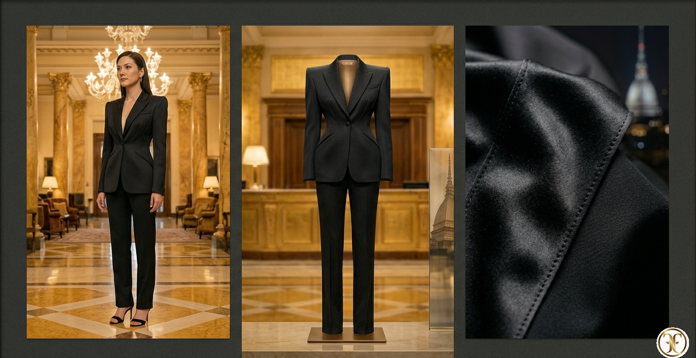 Feature Descrizione Tessuto Silk Wool pesante – Blend esclusivo ad alta densità strutturale. Silhouette Power Tailoring – Spalle scultoree e vita definita. Colore Absolute Onyx – Nero opaco profondo. Accessori Pointed heels neri e diamanti geometrici. Savoir-faire 60 ore di costruzione interna per stabilizzare le spalle architettoniche.