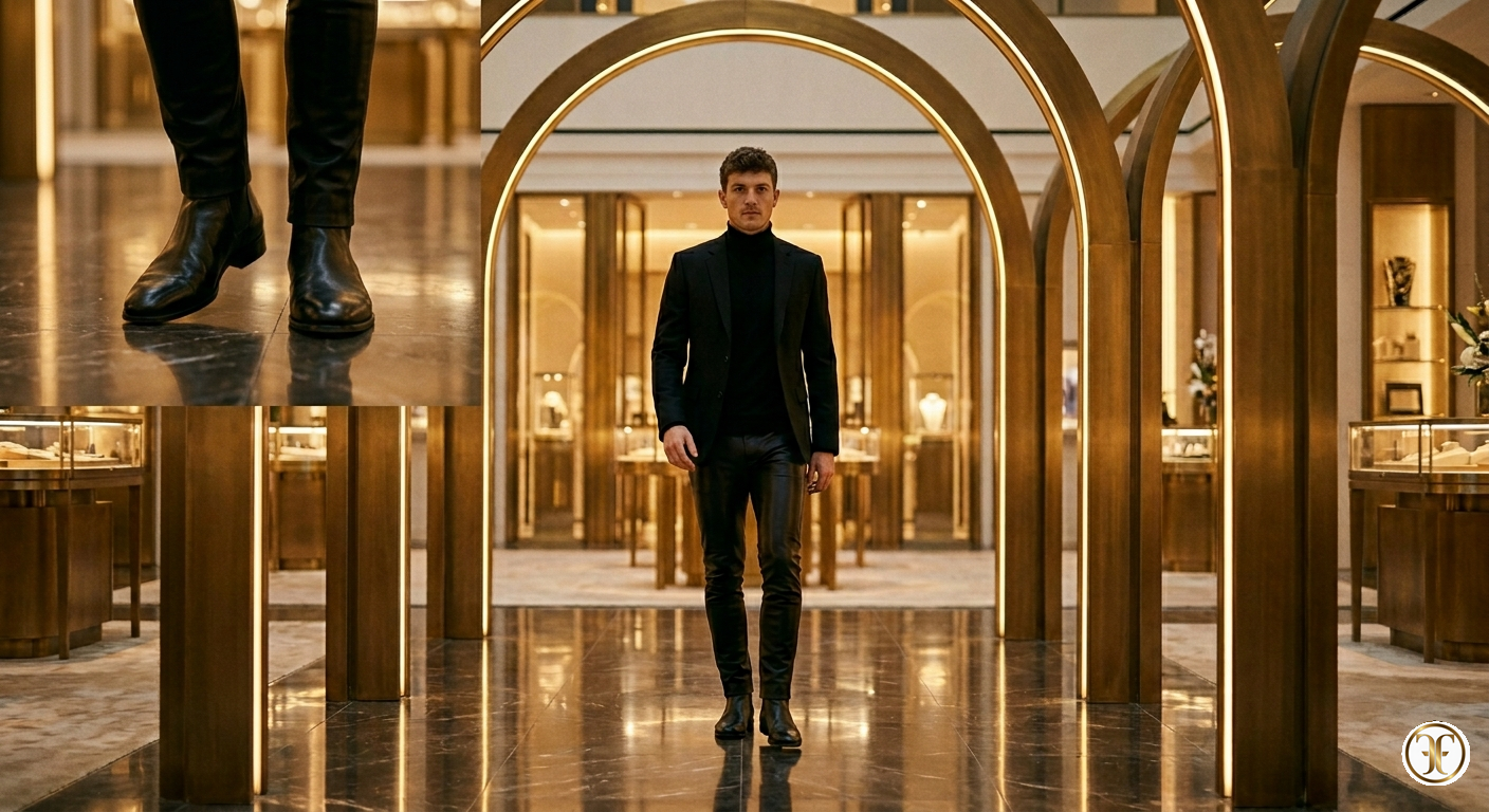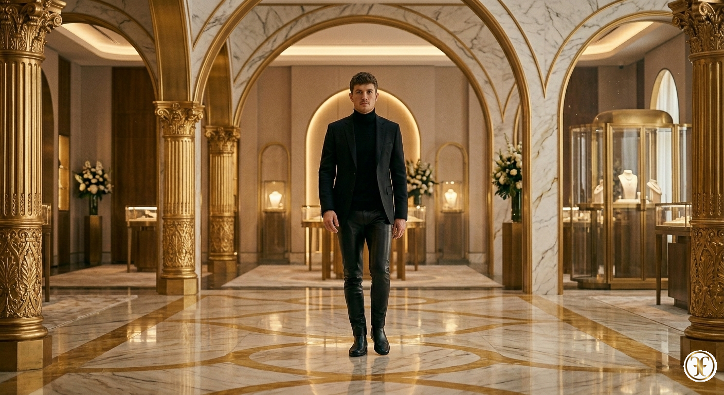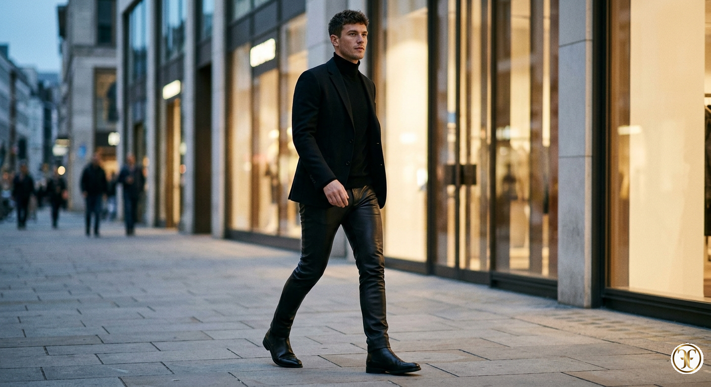 In un set dominato da una luce soffusa e direzionale, il modello incarna una mascolinità sofisticata e consapevole. La luce scivola lungo la gamba, mettendo in risalto la superficie levigata della nappa che reagisce con bagliori discreti, quasi liquidi. I pantaloni Alviero eliminano ogni barriera tra pelle e indumento: la silhouette è asciutta e scattante, perfettamente integrata con una giacca sartoriale e stivali profilati. È l'immagine di un lusso che non ha bisogno di ornamenti, basato interamente sulla perfezione del fitting e sulla nobiltà della materia prima.