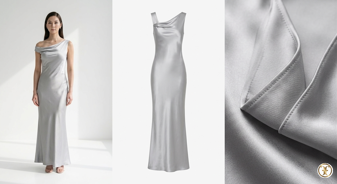 Feature Descrizione Tessuto 100% Seta Satin ad alta grammatura – Finitura specchiata. Tecnica Hidden Boning – Struttura interna per un sostegno verticale. Taglio Asimmetrico off-shoulder con schiena scultorea. Colore Pearl Grey – Grigio perla con riflessi freddi-lunari. Savoir-faire 40 ore di precisione modellistica per calibrare la caduta del tessuto.