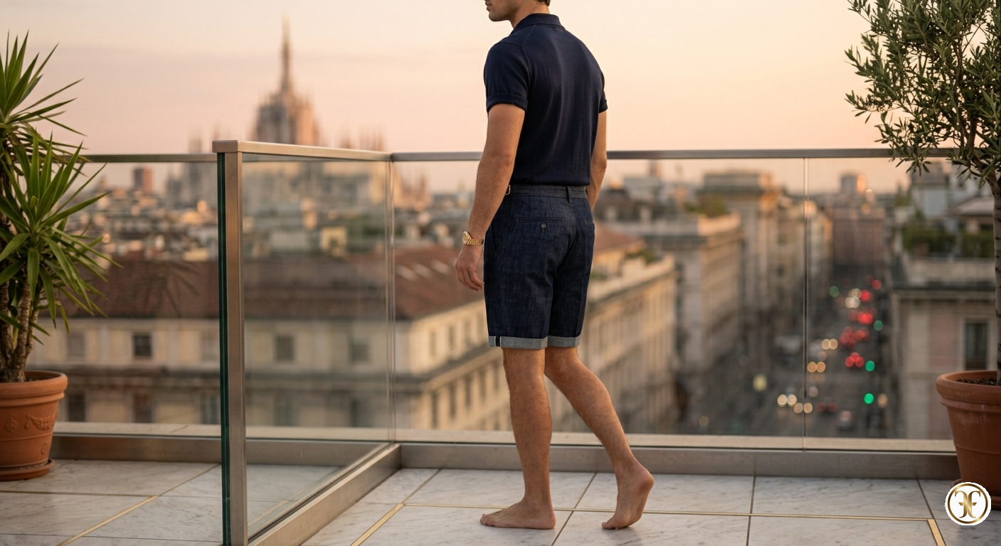 La scena è ambientata sulla sommità di un edificio contemporaneo, dove lo sguardo si perde tra le vette di vetro e acciaio mentre il sole scompare, inondando l’ambiente di una luce dorata radente. Il modello incarna una sofisticatezza moderna e imperturbabile: lo short nero assorbe la luce con un'opacità profonda, interrotta solo dalla texture della maglia polo coordinata. L'atmosfera è vibrante ma composta, una campagna di alta moda che celebra l'uomo che domina la città con un’eleganza silenziosa e rigorosa.
