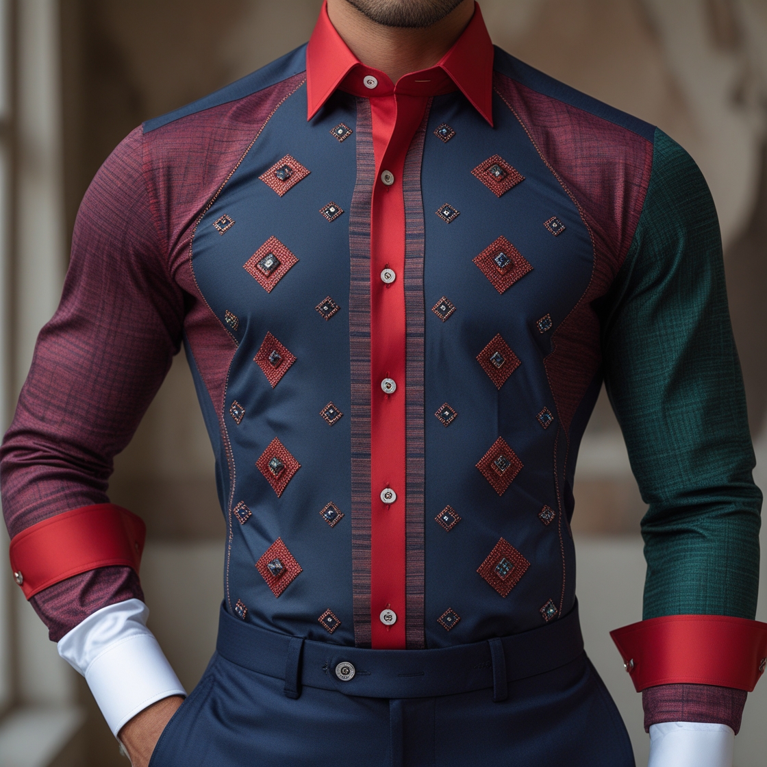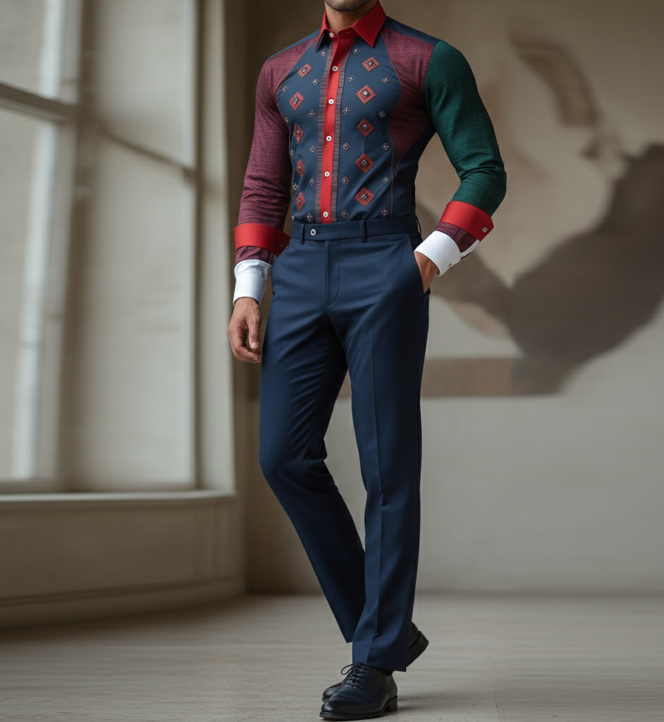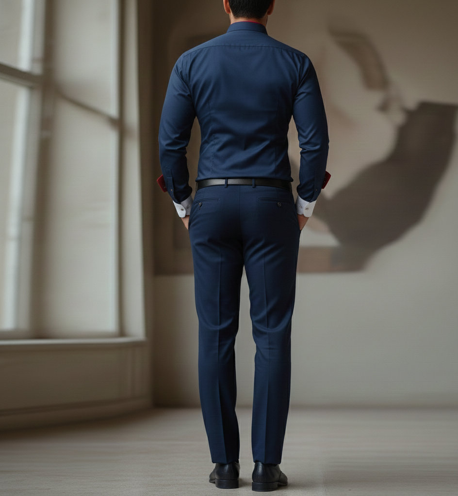 Indossa la camicia professionale blu navy e bordeaux, curata nei minimi dettagli, con il caratteristico colletto e polsini bianchi. Indossa pantaloni blu navy aderenti coordinati e scarpe eleganti in pelle scura. Lo sfondo è un grigio neutro, pulito e uniforme, senza distrazioni. Trama del tessuto della camicia e dettagli dei bottoni risaltano la moda di alto livello.
