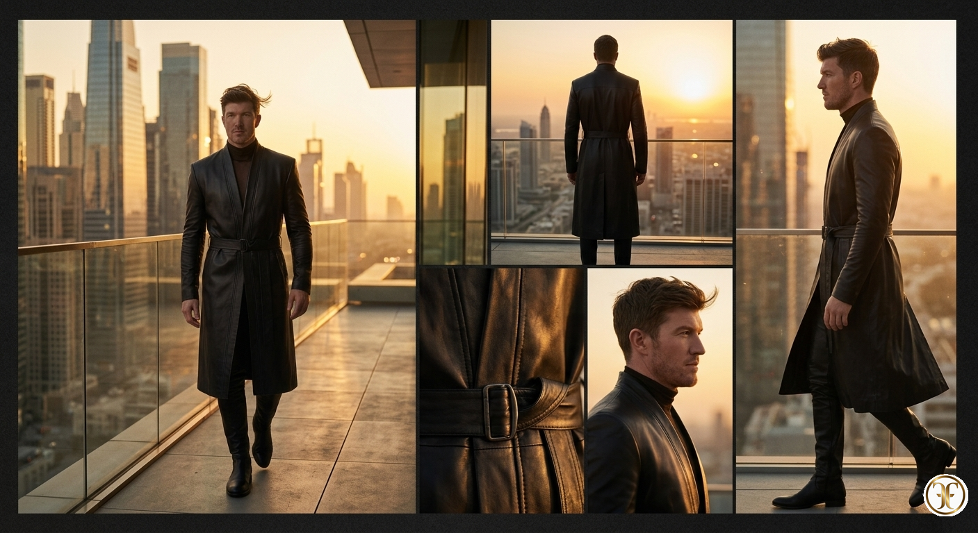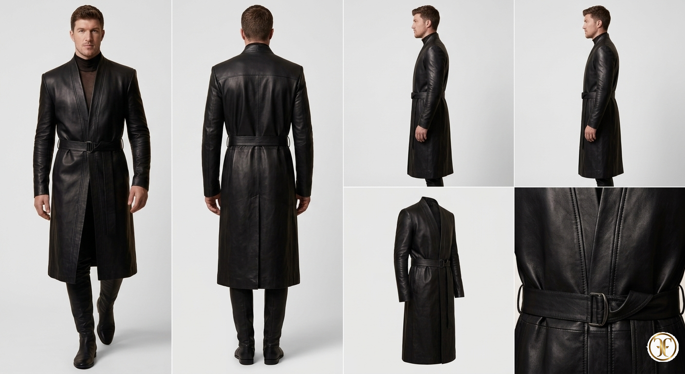 Belted Power Silhouette: Il punto vita è marcato da una cintura alta nello stesso vitello, che permette di modellare il volume del corpo creando una silhouette a "V" potente e definita. La chiusura a vestaglia elimina la necessità di bottoni visibili, mantenendo una pulizia formale assoluta.