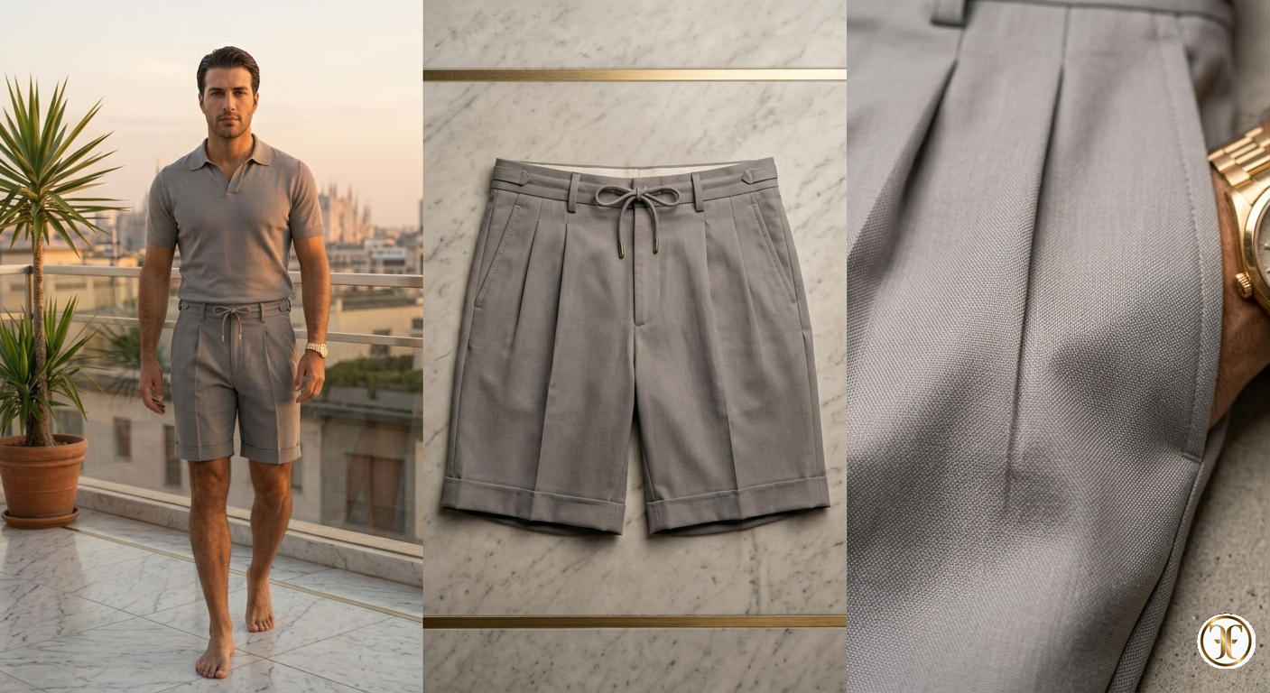 Finitura Soft Shine: Il processo di mercerizzazione non è qui un semplice trattamento, ma una nobilitazione che dona al grigio una profondità metallica. Lo short riflette le luci soffuse del rooftop con una discrezione serica, offrendo una percezione visiva simile a quella di un fresco di lana pregiato.