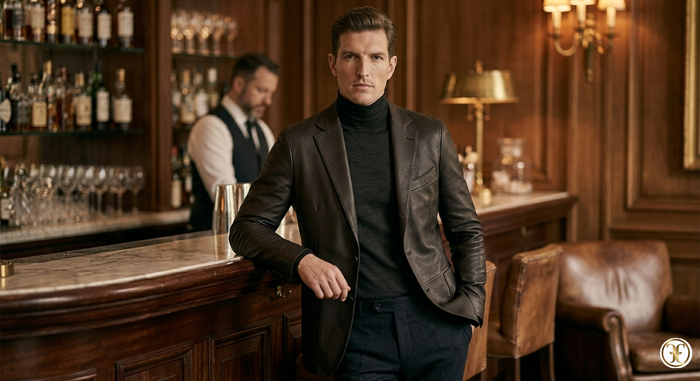 In un ambiente che evoca gli interni di una residenza di lusso, tra legni pregiati e luci soffuse, il modello incarna un’eleganza matura e carismatica. La luce calda e raffinata scivola sulla pelle di cervo, rivelando la sua grana naturale e la sua profondità cromatica. Il colore espresso brown, così intenso da apparire quasi nero nell'ombra, si scalda sotto i riflettori, creando un contrasto sofisticato con la camicia in seta. È un'immagine di lusso sussurrato, dove la giacca non è un’armatura, ma un’estensione fluida e nobile della personalità di chi la indossa.