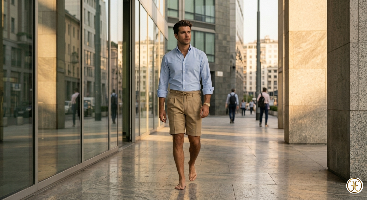 La scena cattura il modello in movimento tra le geometrie di una città moderna: il vetro dei grattacieli e la pietra levigata dei palazzi riflettono una luce solare calda e zenitale. Lo short Khaki reagisce a questi riflessi con una texture levigata e opaca, che si distacca nettamente dai comuni tessuti sportivi. L'abbinamento con una camicia Oxford celeste polvere, dalle maniche arrotolate con studiata noncuranza, crea un look contemporaneo che comunica un'autorità rilassata. La composizione cinematografica enfatizza la fluidità del passo e la stabilità impeccabile del taglio Fasano.