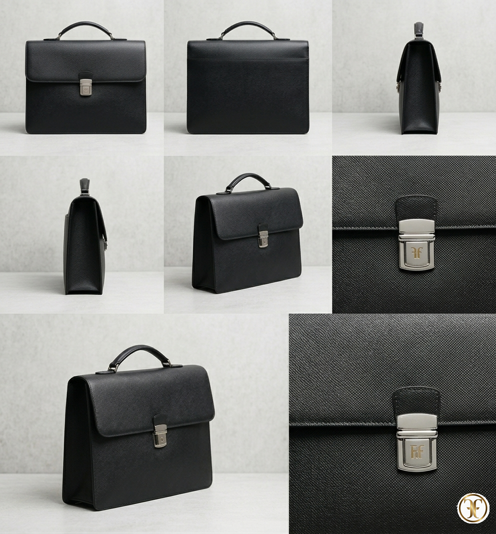 Architectural Rectangular Silhouette: Il design è un esercizio di minimalismo radicale. La forma rettangolare è pura, con angoli definiti e bordi a taglio vivo meticolosamente cerati a mano. La rigidità della struttura garantisce che la valigetta mantenga il suo profilo iconico anche a pieno carico.
