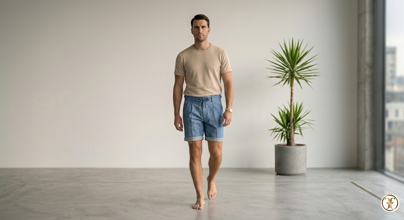 La scena è ambientata sulla sommità di un edificio contemporaneo, dove lo sguardo si perde tra le vette di vetro e acciaio mentre il sole scompare, inondando l’ambiente di una luce dorata radente. Il modello incarna una sofisticatezza moderna e imperturbabile: lo short nero assorbe la luce con un'opacità profonda, interrotta solo dalla texture della maglia polo coordinata. L'atmosfera è vibrante ma composta, una campagna di alta moda che celebra l'uomo che domina la città con un’eleganza silenziosa e rigorosa.