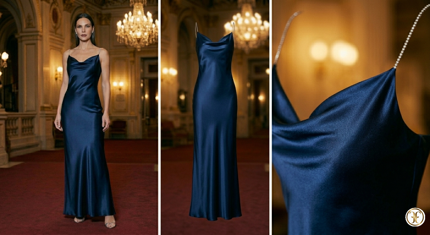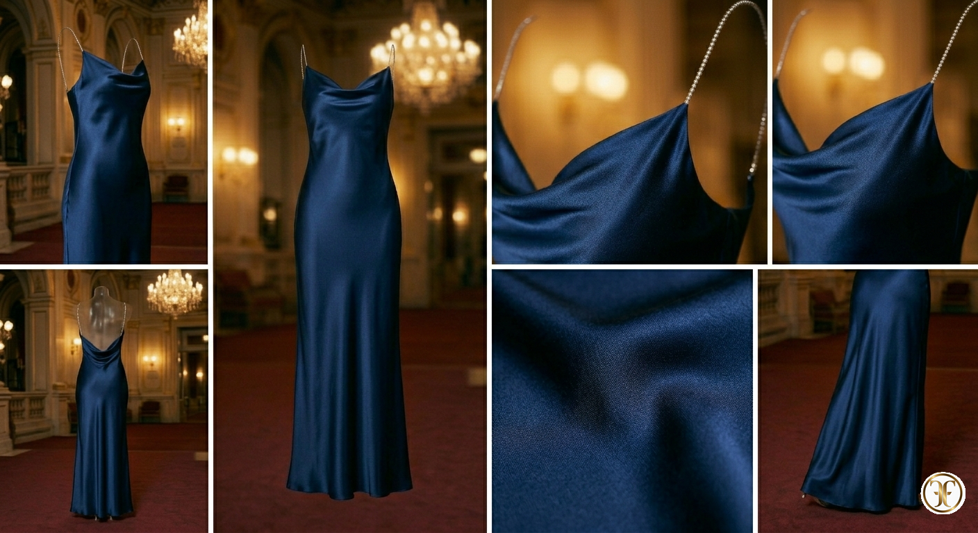 Seta Liquida Midnight Blue: Per questo modello, la Maison ha selezionato un satin di seta dal peso specifico elevato, capace di generare un drappeggio solido ma flessibile. La finitura superficiale è stata trattata con calandratura a specchio per massimizzare la rifrazione luminosa.