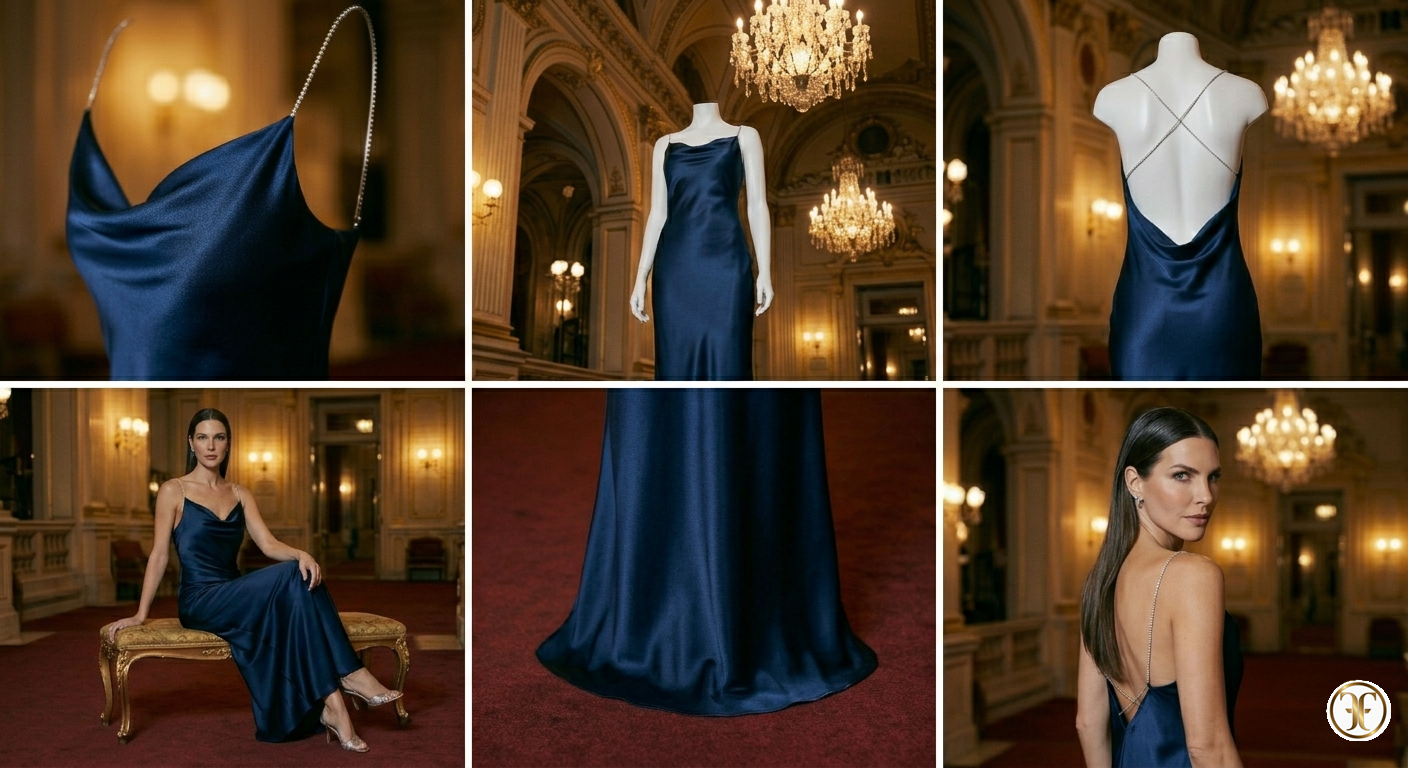 Feature Descrizione Tessuto 100% Seta Satin Liquid – Alta densità e lucentezza specchiata. Costruzione Corsetteria interna destrutturata per supporto architettonico. Dettaglio Back Taglio geometrico profondo con rifinitura a scomparsa. Accessori Tacchi metallici a listini sottili e diamanti minimal. Savoir-faire 45 ore di modellistica per bilanciare il peso del drappeggio.