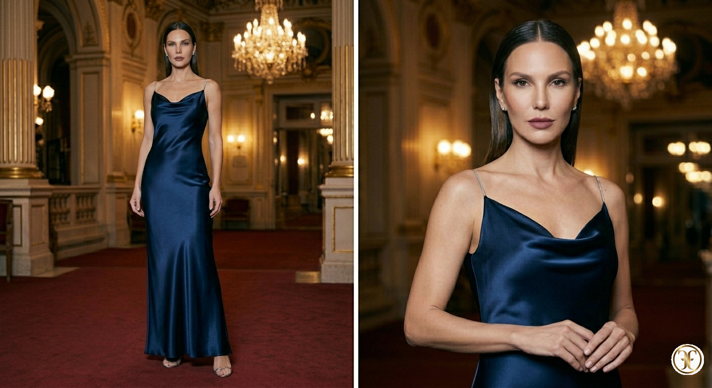 La scena cattura un’eleganza solenne e modernista. La modella indossa un abito lungo fino a terra in seta satin blu mezzanotte profondo, un colore che evoca gli abissi oceanici. La luce cinematografica scivola sulla superficie del tessuto, innescando riflessi che imitano l’acqua in movimento, mentre le ombre profonde accentuano la verticalità della silhouette. L’assenza di gioielli importanti — solo piccoli diamanti ai lobi — e i capelli pettinati sleek dietro le orecchie lasciano che il vero protagonista sia il dialogo tra la pelle e la materia liquida.