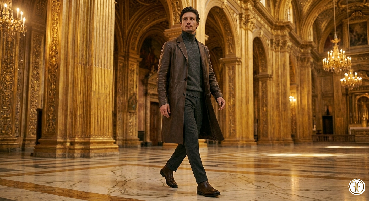 In un set dominato da una luce calda e soffusa, il modello incarna un ideale di lusso intellettuale e rilassato. Il cappotto Lorvian, declinato in un profondo marrone dark chocolate, cattura la luce rivelando una texture organica che sembra vibrare a ogni passo. Non c’è forzatura nel portamento: il materiale asseconda il movimento del corpo con un dinamismo fluido, creando un’immagine di effortless luxury. L’abbinamento con maglieria pregiata e pantaloni sartoriali definisce un’estetica colta, perfetta per chi intende il prestigio come un’esperienza tattile privata prima che un’esibizione pubblica.