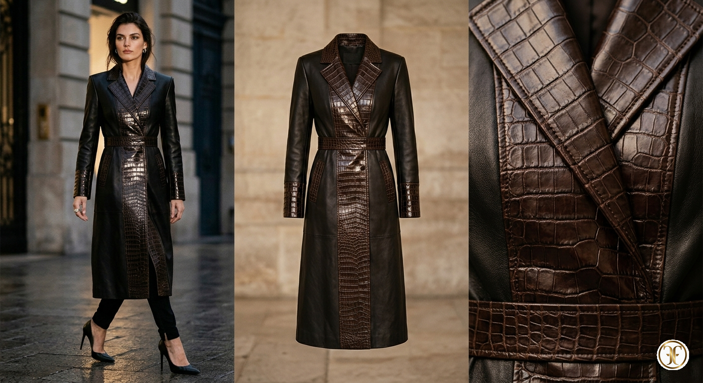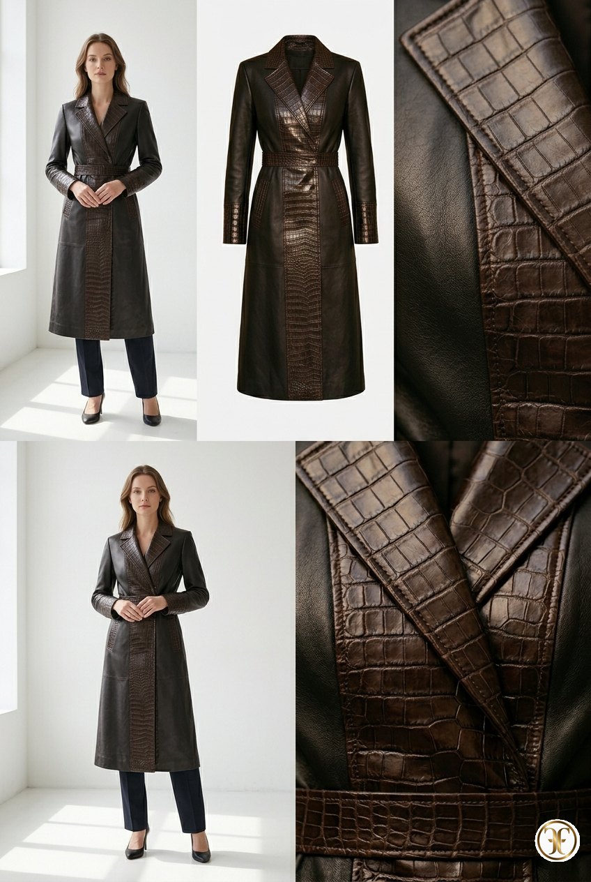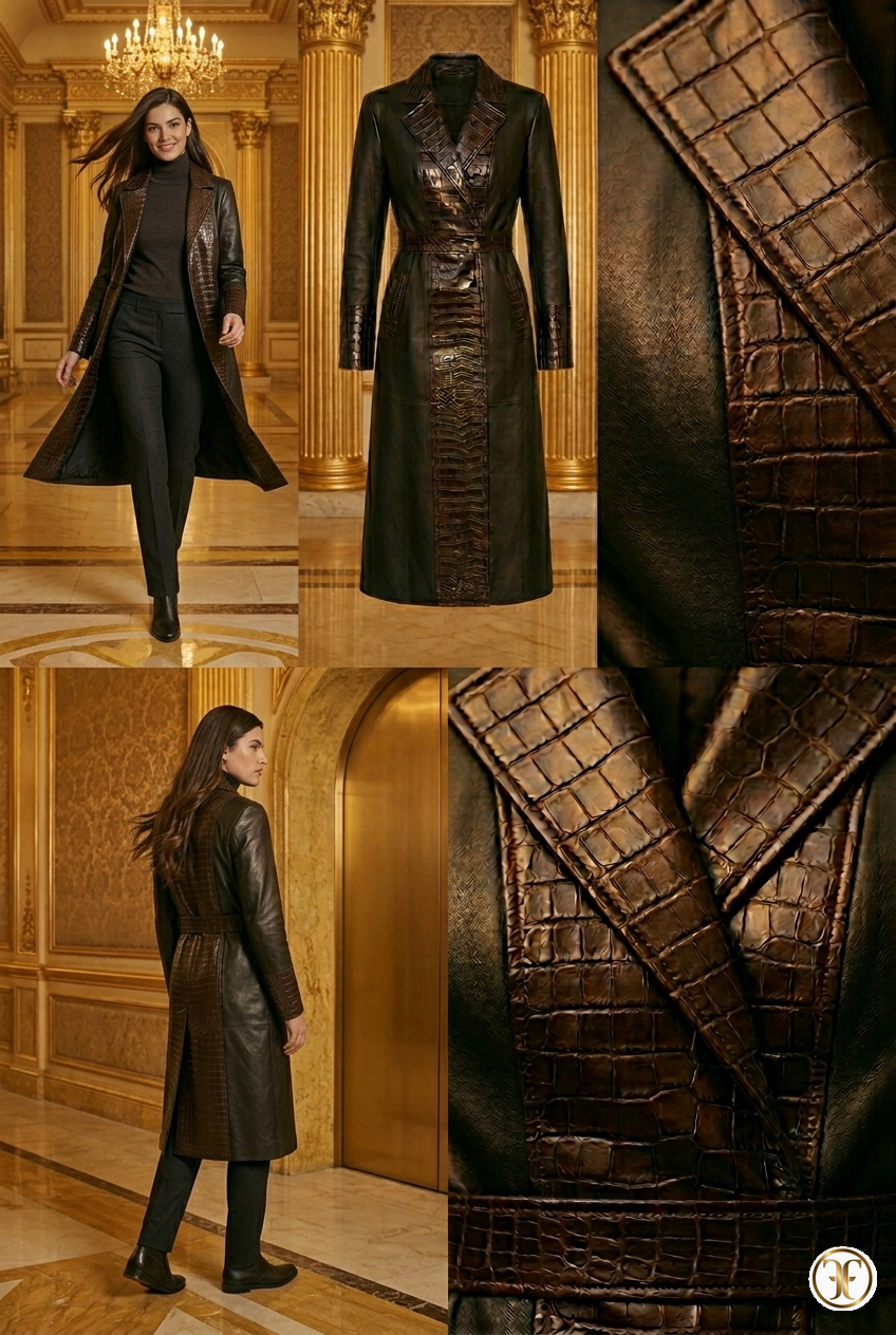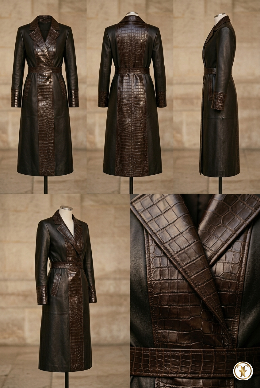 Tailoring d'Eccellenza: Le spalle sono definite e la vita è leggermente accennata, garantendo che il cappotto mantenga una stasi imponente anche in movimento. Ogni cucitura di giunzione tra vitello e coccodrillo è eseguita a mano con una tecnica che elimina qualsiasi spessore, garantendo una superficie impeccabile.