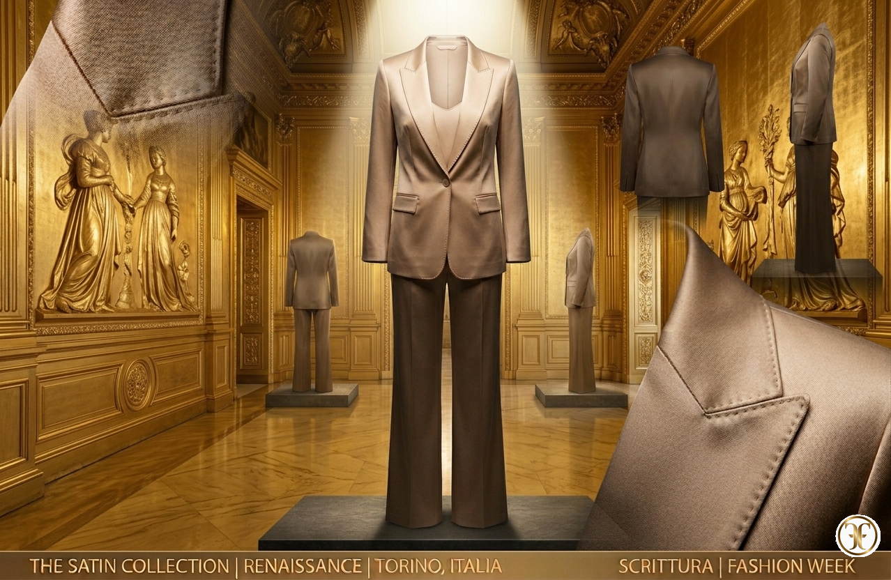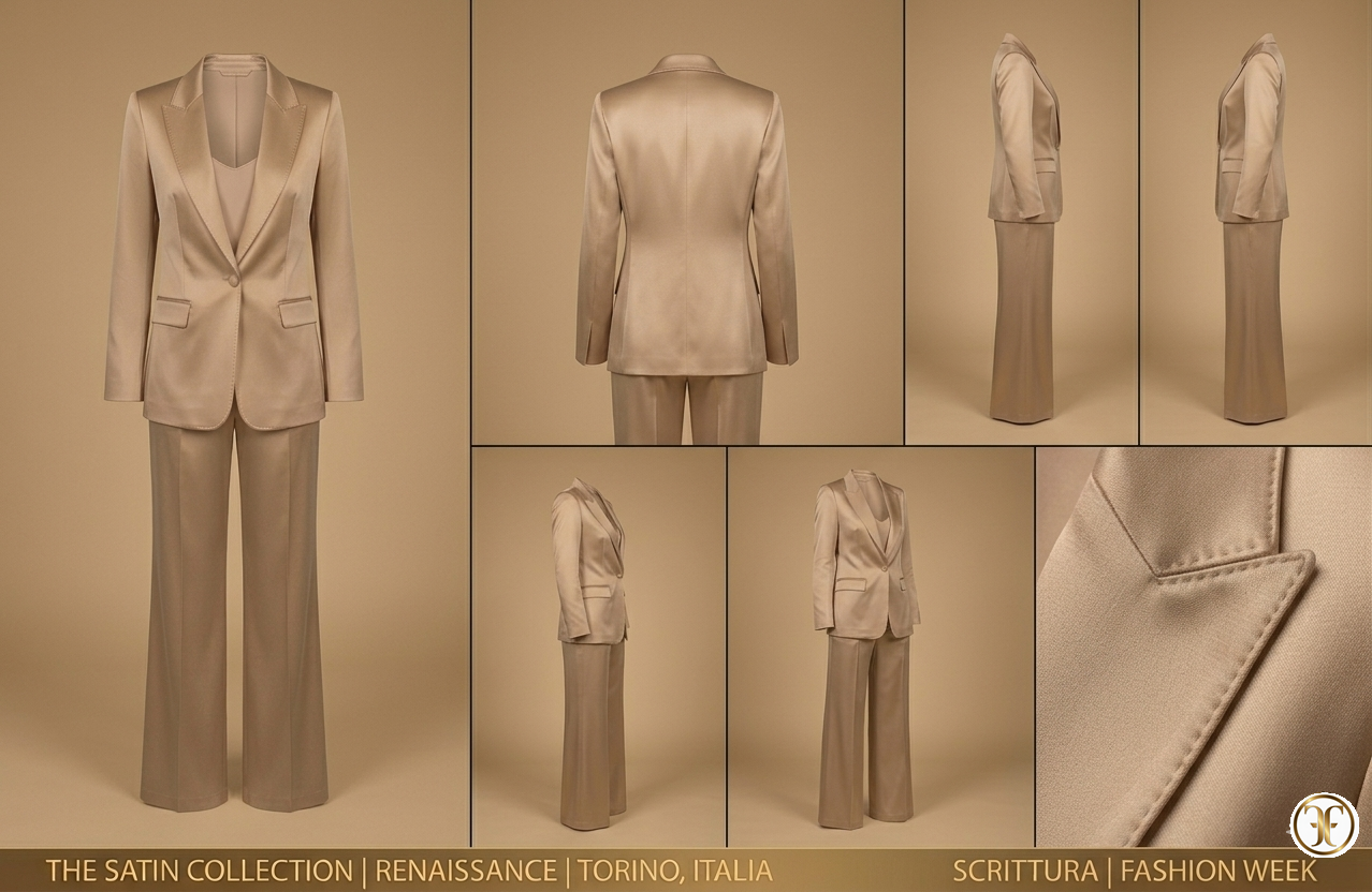 Feature Descrizione Tessuto 100% Seta Satin ad alta grammatura – Tonalità Deep Champagne. Costruzione Blazer decostruito a rever lungo e pantalone palazzo fluido. Effetto Liquid Motion – Riflessione continua e movimento ondulatorio. Accessori Tacchi metallici minimali e diamanti a goccia. Savoir-faire 35 ore di lavorazione per calibrare l'equilibrio dei volumi.