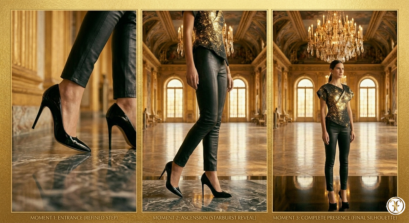In un set avvolto da una luce soffice e vibrante, la modella incarna una bellezza statuaria e dinamica. I pantaloni Morélya seguono ogni contrazione muscolare, reagendo al movimento con bagliori luminosi che scorrono lungo la gamba come mercurio nero. L’abbinamento con un top strutturato e tacchi a stiletto crea un gioco di contrasti architettonici: la rigidità superiore esalta la fluidità assoluta della parte inferiore. È un’immagine di lusso sensoriale, dove l’eleganza non è data da ciò che si aggiunge, ma dalla perfezione di ciò che aderisce.