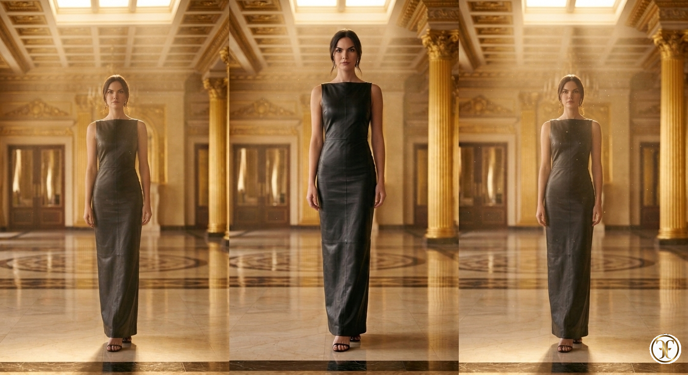 Questa creazione della Maison Fasano rappresenta la sfida definitiva alla materia: trasformare la pelle in un tessuto da gran sera. Il modello Selmora è un inno alla purezza e alla sensualità architettonica, dove la nappa d'agnello perde ogni connotazione di rigidità per farsi colonna di luce scura, aderendo al corpo con la devozione di una seconda pelle.