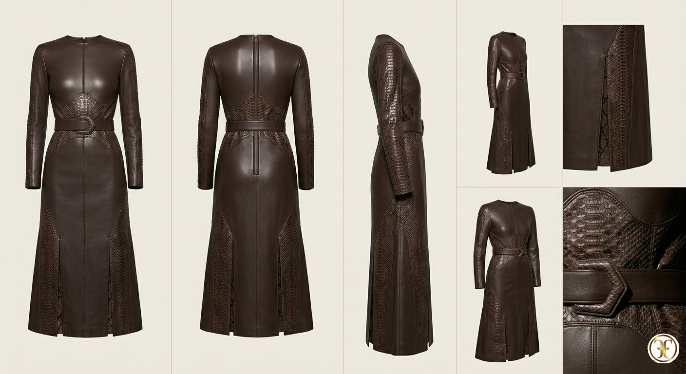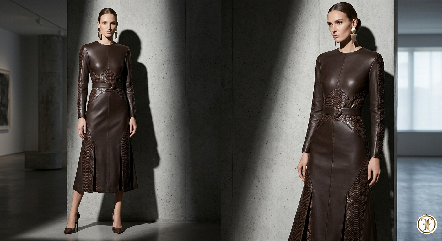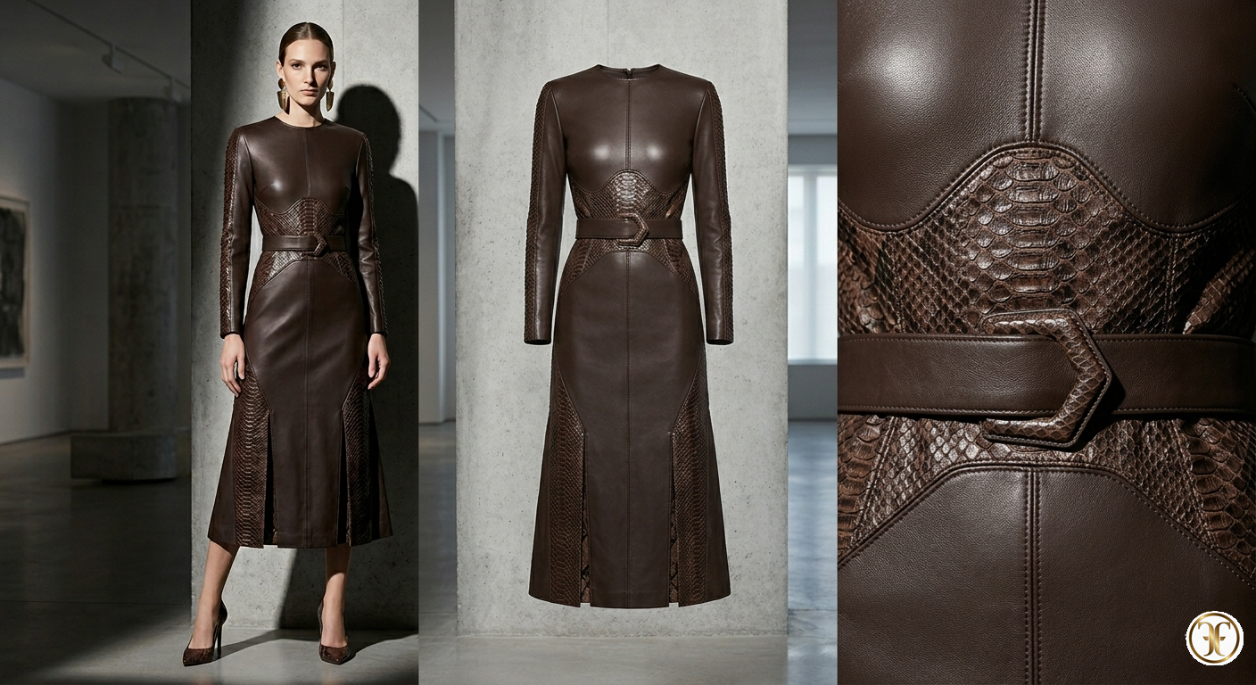 Questa creazione della Maison Fasano rappresenta l'apice della sperimentazione materica, un abito che fonde la modernità della nappa d'agnello con il fascino ancestrale delle pelli esotiche. Il modello Solmèra è un esercizio di equilibrio tra audacia e rigore, progettato per una donna che intende il lusso come un dialogo serrato tra texture e architettura.