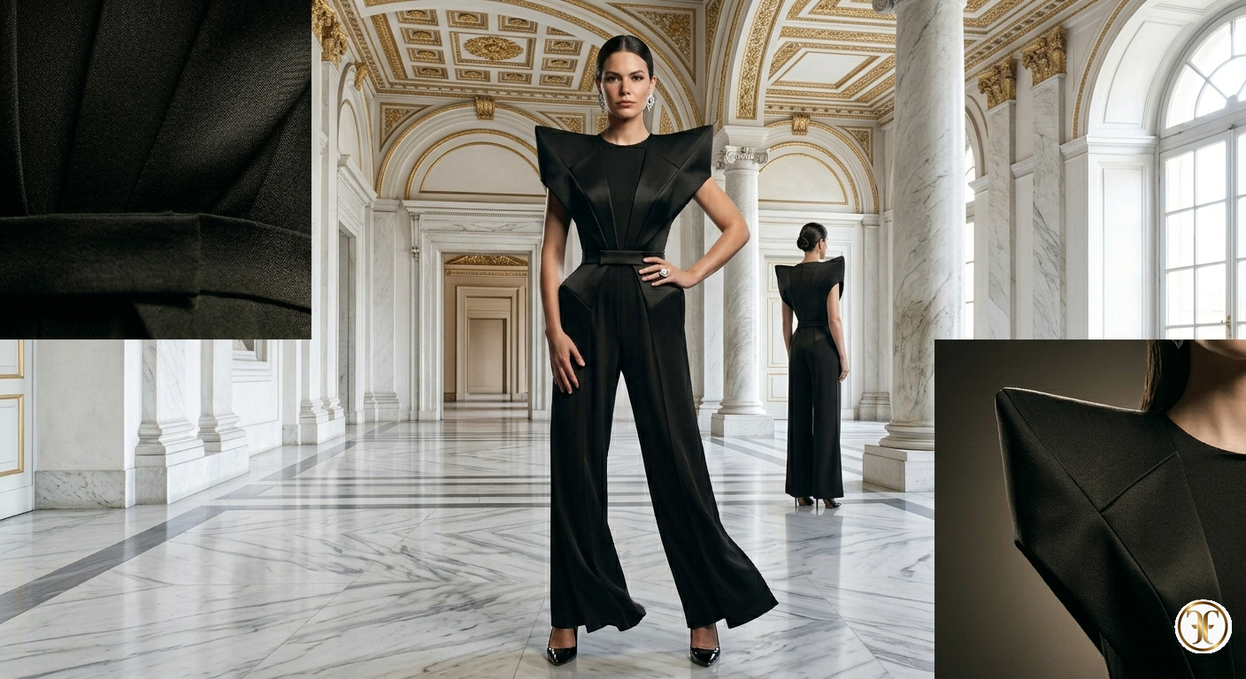 Feature Descrizione Tessuto Silk Wool Crepe Pesante – Texture opaca e strutturata. Silhouette Architectural Power – Spalle esagerate e vita ultra-definita. Taglio Busto geometrico rigido e gamba dritta fluida. Accessori Pointed heels neri e diamanti dal taglio geometrico. Savoir-faire 58 ore di costruzione interna per stabilizzare i volumi scultorei.