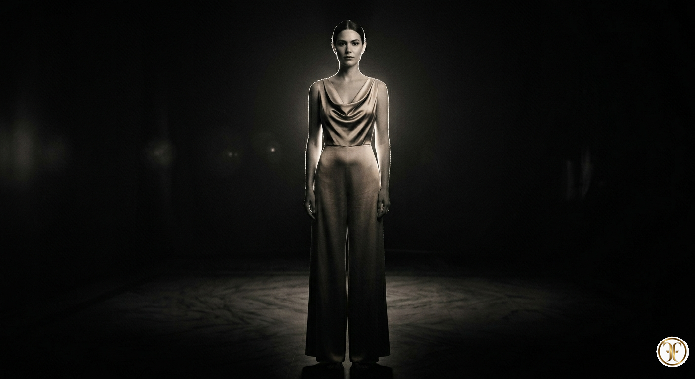 In un set avvolto da una luce calda e riflessiva, la modella incarna una bellezza magnetica e senza tempo. La jumpsuit, declinata in una tonalità champagne profondo, cattura ogni raggio luminoso restituendolo in gradienti morbidi e dorati. L'atmosfera cinematografica enfatizza la texture del tessuto, che appare quasi fuso sulla pelle. Il soft low bun e i piccoli diamanti ai lobi completano un’immagine di lusso sussurrato, dove il movimento costante del raso crea una danza di luci e ombre che segue ogni passo con grazia regale.