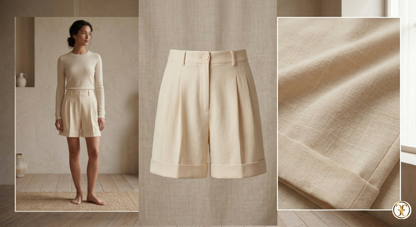La scena si svolge in uno studio dalle tonalità burro e sabbia, inondato da una luce naturale diffusa che elimina ogni contrasto netto. La modella è avvolta in un’atmosfera di calma assoluta: lo short in avorio caldo sembra fondersi con la pelle, rivelando una texture così uniforme e soffice da apparire quasi nebulosa. La composizione cinematografica si sofferma sulla resa tattile del blend, catturando la delicatezza di un capo che non urla la sua preziosità, ma la sussurra attraverso la perfezione della sua luce naturale.