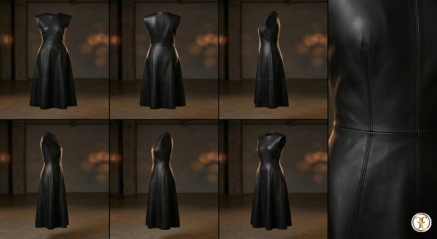 In un set industriale dalle ombre nette e decise, la modella emerge come una figura statuaria ritagliata nel buio. La luce drammatica colpisce radente la superficie del vitello, mettendo in risalto la micro-grana naturale della pelle e la precisione chirurgica delle cuciture. La silhouette è potente: le spalle definite e la vita stretta creano una tensione visiva che comunica autorità e grazia. L'abbinamento con tacchi a stiletto neri e gioielli minimali pone l'intero focus sulla costruzione dell'abito, trasformando la modella in una divinità moderna della geometria sartoriale.
