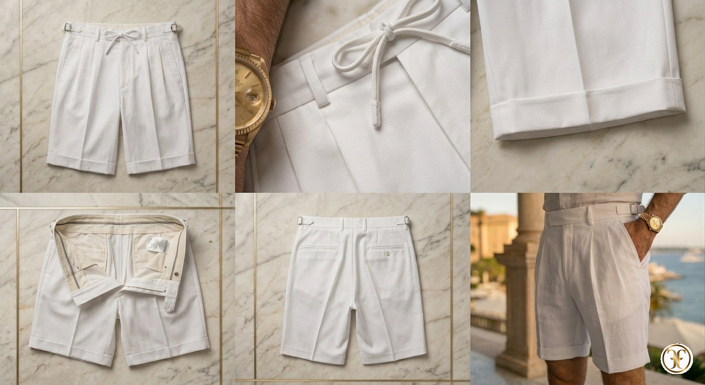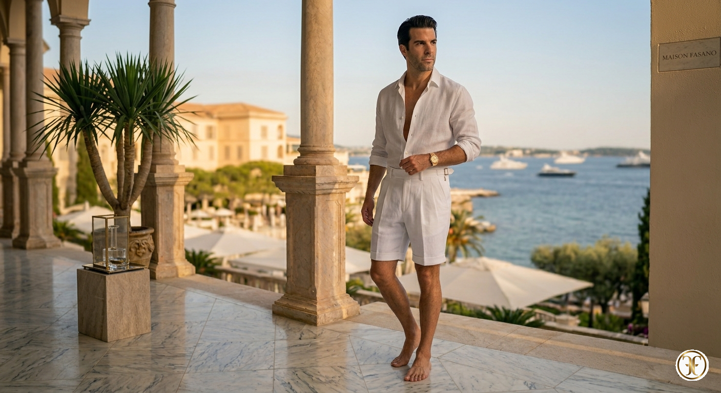 La scena è immersa nella luce dorata dell'ora che precede il tramonto su una terrazza mediterranea dalle linee brutaliste e minimali. Il modello incarna un ideale di nobiltà rilassata: i volumi generosi dello short in lino egiziano extra-fine reagiscono al vento costiero, creando un dinamismo scultoreo che solo le fibre naturali di altissimo pregio possono offrire. È un’immagine di "Quiet Luxury" radicale, dove l'architettura circostante e il tessuto si fondono in un'unica estetica di ordine e serenità.